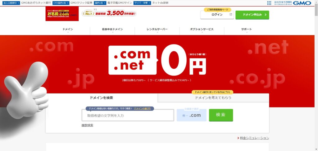 お名前.comは、国内最大級のドメイン登録サービスで、豊富な種類のドメインを取り扱っています。