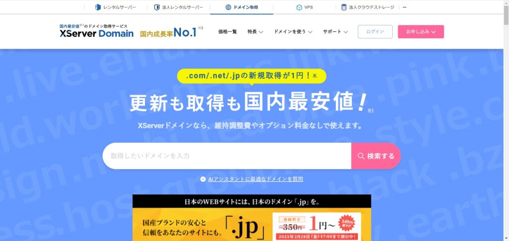 エックスサーバードメインは、エックスサーバーと連携しやすいドメイン取得サービスです。